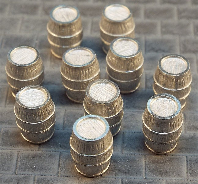 10 individual metal cast wooden barrels each 11mm tall & 9mm max dia.