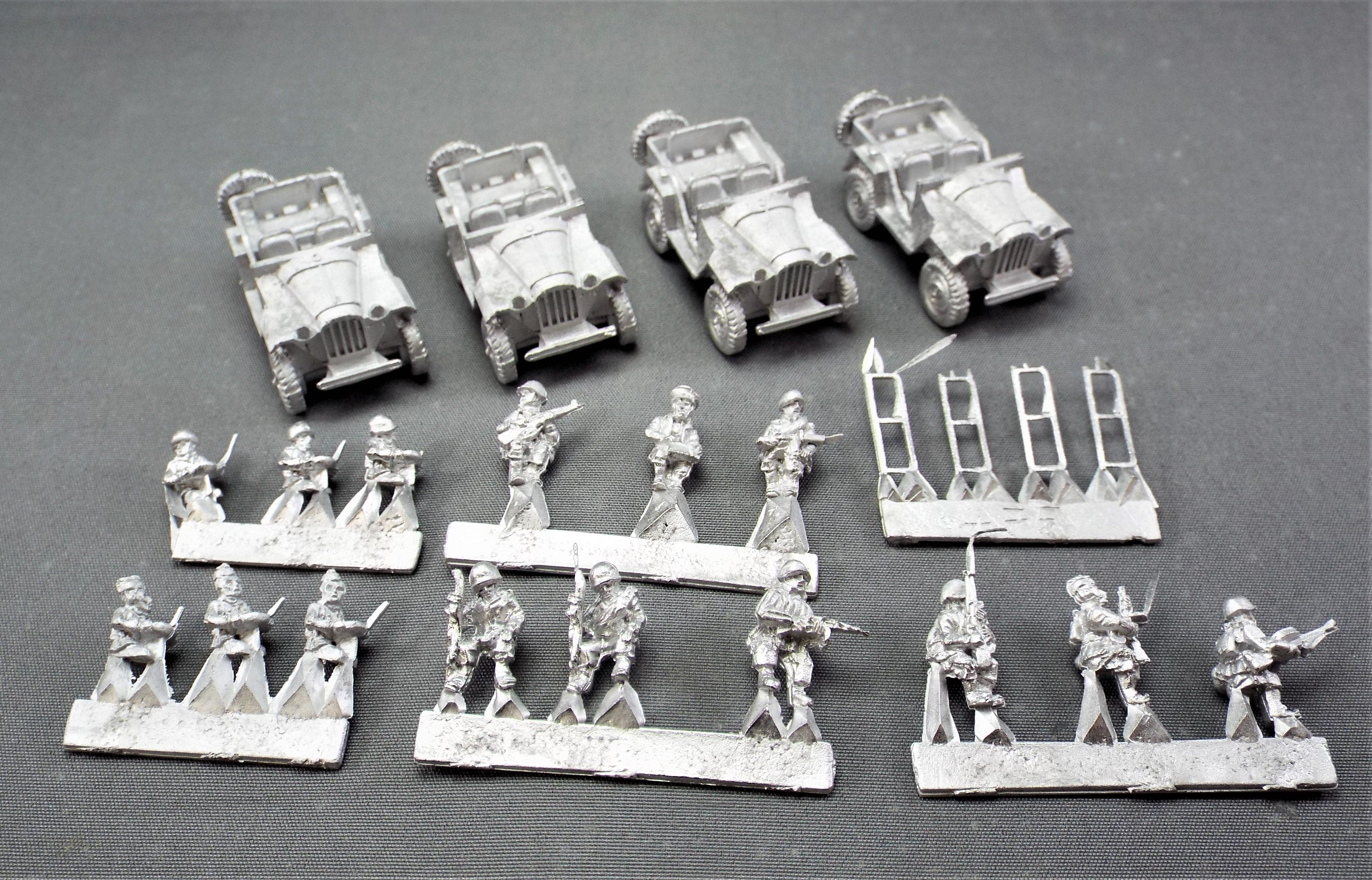 Russian Gaz 67 Jeep Pack with Crew. 4 one-piece Jeep models with separate windscreens plus 15 crew members. A selection of 6 drivers and 9 passengers including 1 officer, 1 holding a D.P LMG, 3 with PPSh SMG & 4 with rifles.